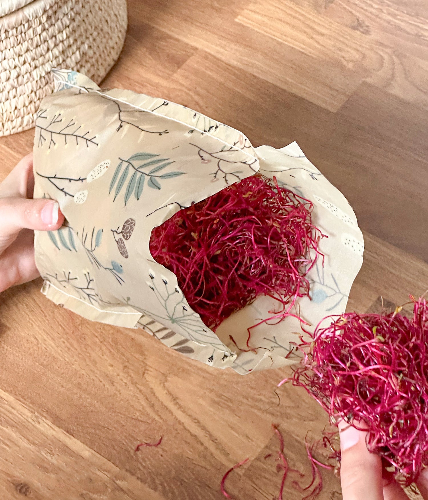 Till skillnad från plastpåsar som bara slängs efter varje användning är bivaxpåsar återanvändbara! Fyll påsen med vatten och en droppe diskmedel och skaka påsen. Skölj ur och låt torka. Håller i minst ett år, oftast längre!